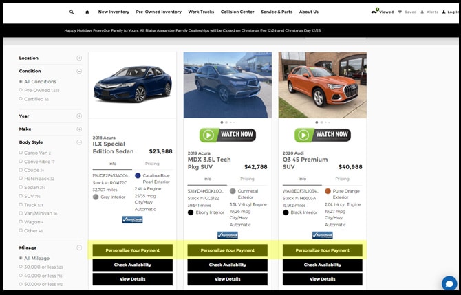 Choose from our wide selection of sedans, hybrids, trucks, vans, and SUV's ... and Blaise Your Deal. Save time and make the purchase of your new or preowned vehicle at Blaise Alexander Family Dealerships your way. Select the vehicle you want, and click on Personalize My Payments.Â
