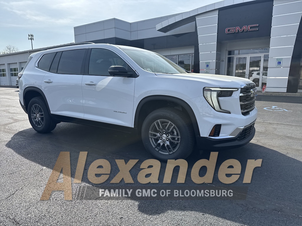 Summit White 2025 GMC Acadia Elevation AWD, After Dark Cloth. Preferred Equipment Group 4SD, AWD, After Dark Cloth, 12 Speakers, 18 x 7.5 Aluminum Wheels, 2-Way Driver Power Lumbar Seat Adjuster, 3.49 Final Drive Axle Ratio, 3rd row seats: split-bench, 4-Way Manual Front Passenger Seat Adjuster, 4-Wheel Disc Brakes, 8-Passenger Seating (2-3-3 Seating Configuration), 8-Way Power Driver Seat Adjuster, ABS brakes, Air Conditioning, Alloy wheels, AM/FM radio: SiriusXM with 360L, Apple CarPlay/Android Auto, Auto High-beam Headlights, Auto-dimming Rear-View mirror, Automatic temperature control, Bodyside moldings, Bose Premium 12-Speaker System w/Sub-Woofer, Brake assist, Bumpers: body-color, Cloth Seat Trim, Compass, Delay-off headlights, Driver door bin, Driver vanity mirror, Dual front impact airbags, Dual front side impact airbags, Electronic Stability Control, Emergency communication system: OnStar Services capable, Exterior Parking Camera Rear, Four wheel independent suspension, Front anti-roll bar, Front Bucket Seats, Front Center Armrest, Front dual zone A/C, Front fog lights, Front License Plate Bracket, Front reading lights, Fully automatic headlights, Heated door mirrors, Heated Driver & Front Passenger Seats, Heated front seats, Heated steering wheel, Illuminated entry, Leather steering wheel, Low tire pressure warning, Navigation System, Occupant sensing airbag, Outside temperature display, Overhead airbag, Overhead console, Panic alarm, Passenger door bin, Passenger vanity mirror, Power door mirrors, Power driver seat, Power Liftgate, Power steering, Power windows, Radio data system, Radio: 15 Premium GMC Infotainment System, Rear air conditioning, Rear anti-roll bar, Rear reading lights, Rear seat center armrest, Rear side impact airbag, Rear window defroster, Rear window wiper, Remote keyless entry, Security system, SiriusXM w/360L, Speed control, Speed-sensing steering, Split folding rear seat, Spoiler, Sport steering wheel, Steering wheel mounted audio controls, Tachometer, Telescoping steering wheel, Tilt steering wheel, Traction control, Trip computer, Turn signal indicator mirrors, Variably intermittent wipers, and Voltmeter.