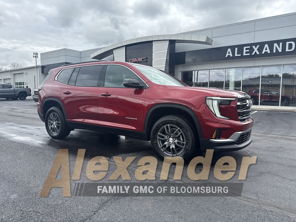Volcanic Red 2025 GMC Acadia Elevation AWD, After Dark Cloth. Preferred Equipment Group 4SD, AWD, After Dark Cloth, 12 Speakers, 18 x 7.5 Aluminum Wheels, 2-Way Driver Power Lumbar Seat Adjuster, 3.49 Final Drive Axle Ratio, 3rd row seats: split-bench, 4-Way Manual Front Passenger Seat Adjuster, 4-Wheel Disc Brakes, 8-Passenger Seating (2-3-3 Seating Configuration), 8-Way Power Driver Seat Adjuster, ABS brakes, Air Conditioning, Alloy wheels, AM/FM radio: SiriusXM with 360L, Apple CarPlay/Android Auto, Auto High-beam Headlights, Auto-dimming Rear-View mirror, Automatic temperature control, Bodyside moldings, Bose Premium 12-Speaker System w/Sub-Woofer, Brake assist, Bumpers: body-color, Cloth Seat Trim, Compass, Delay-off headlights, Driver door bin, Driver vanity mirror, Dual front impact airbags, Dual front side impact airbags, Electronic Stability Control, Emergency communication system: OnStar Services capable, Exterior Parking Camera Rear, Four wheel independent suspension, Front anti-roll bar, Front Bucket Seats, Front Center Armrest, Front dual zone A/C, Front fog lights, Front License Plate Bracket, Front reading lights, Fully automatic headlights, Heated door mirrors, Heated Driver & Front Passenger Seats, Heated front seats, Heated steering wheel, Illuminated entry, Leather steering wheel, Low tire pressure warning, Navigation System, Occupant sensing airbag, Outside temperature display, Overhead airbag, Overhead console, Panic alarm, Passenger door bin, Passenger vanity mirror, Power door mirrors, Power driver seat, Power Liftgate, Power steering, Power windows, Radio data system, Radio: 15 Premium GMC Infotainment System, Rear air conditioning, Rear anti-roll bar, Rear reading lights, Rear seat center armrest, Rear side impact airbag, Rear window defroster, Rear window wiper, Remote keyless entry, Security system, SiriusXM w/360L, Speed control, Speed-sensing steering, Split folding rear seat, Spoiler, Sport steering wheel, Steering wheel mounted audio controls, Tachometer, Telescoping steering wheel, Tilt steering wheel, Traction control, Trip computer, Turn signal indicator mirrors, Variably intermittent wipers, and Voltmeter.