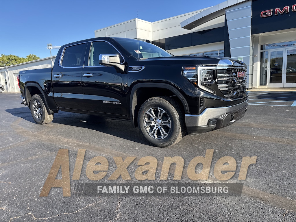 Onyx Black 2026 GMC Sierra 1500 SLT 10-Speed Automatic, 4WD, Black Leather. Preferred Equipment Group 4SA (120-Volt Bed Mounted Power Outlet, 120-Volt Interior Power Outlet, 170 Amp Alternator, 2 Charge/Data USB Ports, 2 Type-C Charge-Only Rear USB Ports, 6-Speaker Audio System Feature, Auto-Locking Rear Differential, Auxiliary External Transmission Oil Cooler, Chrome Header & Chrome Grille Insert Bars, Color-Keyed Carpeting Floor Covering, Deep-Tinted Glass, Electric Rear-Window Defogger, Front Frame-Mounted Black Recovery Hooks, Front Rain-Sensing Wipers, HD Rear Vision Camera, Integrated Trailer Brake Controller, Keyless Open & Start, LED Cargo Area Lighting, Manual Tilt-Wheel & Telescoping Steering Column, OnStar Services Capable, Perimeter Lighting, Power Door Locks, Power Front Passenger Windows w/Express Up/Down, Power Front Windows w/Driver Express Up/Down, Power Rear Windows w/Express Down, Push Button Start, Rear Wheelhouse Liners, Remote Vehicle Starter System, SiriusXM w/360L Trial Subscription, Steering Wheel Audio Controls, Theft Deterrent System (Unauthorized Entry), and Wi-Fi Hotspot Capable), Standard Suspension Package, Trailering Package (Hitch Guidance), 10-Speed Automatic, 4WD, Black Leather, 10-Way Power Driver Seat Adjuster w/Lumbar, 10-Way Power Passenger Seat Adjuster w/Lumbar, 3.23 Rear Axle Ratio, 4-Wheel Disc Brakes, 6 Speakers, ABS brakes, Air Conditioning, Alloy wheels, AM/FM radio: SiriusXM with 360L, Apple CarPlay/Android Auto, Auto High-beam Headlights, Auto-dimming door mirrors, Auto-dimming Rear-View mirror, Automatic Emergency Braking, Automatic temperature control, Brake assist, Buckle to Drive, Bumpers: chrome, Compass, Delay-off headlights, Driver door bin, Driver Memory, Driver vanity mirror, Dual front impact airbags, Dual front side impact airbags, Electronic Stability Control, Emergency communication system: OnStar, Following Distance Indicator, Forward Collision Alert, Front 40/20/40 Split-Bench Seat, Front anti-roll bar, Front Center Armrest w/Storage, Front dual zone A/C, Front fog lights, Front Pedestrian Braking, Front reading lights, Front wheel independent suspension, Fully automatic headlights, Heated door mirrors, Heated Driver & Front Outboard Passenger Seating, Heated front seats, Heated steering wheel, Illuminated entry, IntelliBeam Automatic High Beam On/Off, Lane Keep Assist w/Lane Departure Warning, Low tire pressure warning, Memory seat, Navigation System, Occupant sensing airbag, Outside temperature display, Overhead airbag, Overhead console, Panic alarm, Passenger door bin, Passenger vanity mirror, Perf Leather-Appointed Front Outboard Seat Trim, Power door mirrors, Power driver seat, Power passenger seat, Power steering, Power windows, Radio data system, Radio: Premium GMC Infotainment Audio System, Rain sensing wipers, Rear reading lights, Rear seat center armrest, Rear step bumper, Rear window defroster, Remote keyless entry, Security system, Speed control, Speed-sensing steering, Split folding rear seat, Steering wheel mounted audio controls, Tachometer, Telescoping steering wheel, Tilt steering wheel, Traction control, Trip computer, Variably intermittent wipers, Voltmeter, Wheels: 18 x 8.5 6-Spoke Machined Aluminum, and Wireless Apple CarPlay/Wireless Android Auto.