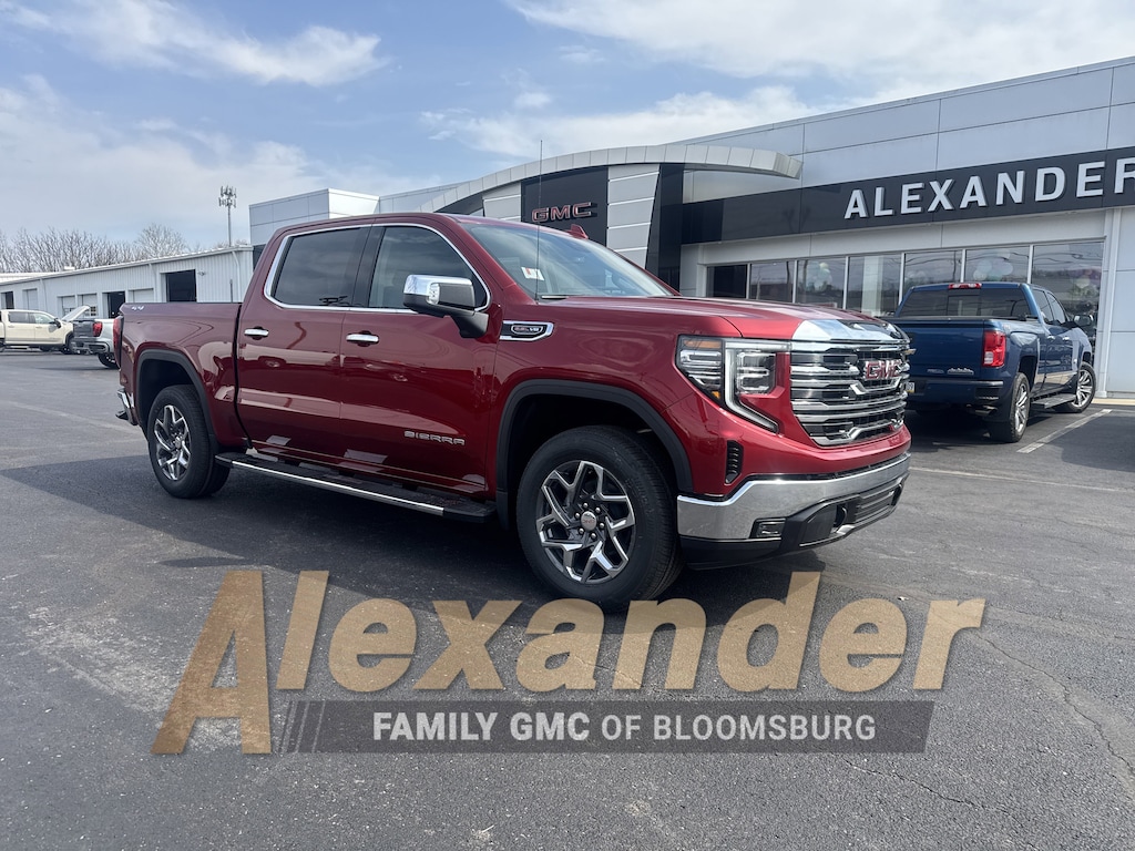 Volcanic Red 2026 GMC Sierra 1500 SLT 10-Speed Automatic, 4WD, Jet Blk Perforated Lth-Ap Leather. Standard Suspension Package, Trailering Package (Hitch Guidance), 10-Speed Automatic, 4WD, Jet Blk Perforated Lth-Ap Leather, 10-Way Power Driver Seat Adjuster with Lumbar, 10-Way Power Passenger Seat Adjuster with Lumbar, 120-Volt Bed Mounted Power Outlet, 120-Volt Interior Power Outlet, 170 Amp Alternator, 2 Charge/Data USB Ports, 2 Type-C Charge-Only Rear USB Ports, 3.23 Rear Axle Ratio, 4-Wheel Disc Brakes, 6 Speakers, 6-Speaker Audio System Feature, ABS brakes, Air Conditioning, Alloy wheels, AM/FM radio: SiriusXM with 360L, Apple CarPlay/Android Auto, Auto High-beam Headlights, Auto-dimming door mirrors, Auto-dimming Rear-View mirror, Auto-Locking Rear Differential, Automatic Emergency Braking, Automatic temperature control, Auxiliary External Transmission Oil Cooler, Brake assist, Buckle to Drive, Bumpers: chrome, Chrome Header and Chrome Grille Insert Bars, Color-Keyed Carpeting Floor Covering, Compass, Deep-Tinted Glass, Delay-off headlights, Driver door bin, Driver Memory, Driver vanity mirror, Dual front impact airbags, Dual front side impact airbags, Electric Rear-Window Defogger, Electronic Stability Control, Emergency communication system: OnStar, Following Distance Indicator, Forward Collision Alert, Front 40/20/40 Split-Bench Seat, Front anti-roll bar, Front Center Armrest w/Storage, Front dual zone A/C, Front fog lights, Front Frame-Mounted Black Recovery Hooks, Front Pedestrian Braking, Front Rain-Sensing Wipers, Front reading lights, Front wheel independent suspension, Fully automatic headlights, HD Rear Vision Camera, Heated door mirrors, Heated Driver and Front Outboard Passenger Seating, Heated front seats, Heated steering wheel, Illuminated entry, Integrated Trailer Brake Controller, IntelliBeam Automatic High Beam on/Off, Keyless Open and Start, Lane Keep Assist with Lane Departure Warning, LED Cargo Area Lighting, Low tire pressure warning, Manual Tilt-Wheel and Telescoping Steering Column, Memory seat, Navigation System, Occupant sensing airbag, OnStar Services Capable, Outside temperature display, Overhead airbag, Overhead console, Panic alarm, Passenger door bin, Passenger vanity mirror, Perforated Leather-Appointed Front Outboard Seat Trim, Perimeter Lighting, Power Door Locks, Power door mirrors, Power driver seat, Power Front Passenger Windows with Express Up/Down, Power Front Windows with Driver Express Up/Down, Power passenger seat, Power Rear Windows with Express Down, Power steering, Power windows, Push Button Start, Radio data system, Radio: Premium GMC Infotainment Audio System, Rain sensing wipers, Rear reading lights, Rear seat center armrest, Rear step bumper, Rear Wheelhouse Liners, Rear window defroster, Remote keyless entry, Remote Vehicle Starter System, Security system, SiriusXM with 360L Trial Subscription, Speed control, Speed-sensing steering, Split folding rear seat, Steering Wheel Audio Controls, Steering wheel mounted audio controls, Tachometer, Telescoping steering wheel, Theft Deterrent System (unauthorized Entry), Tilt steering wheel, Traction control, Trip computer, Variably intermittent wipers, Voltmeter, Wheels: 18 x 8.5 6-Spoke Machined Aluminum, Wi-Fi Hotspot Capable, and Wireless Apple CarPlay/Wireless Android Auto.
