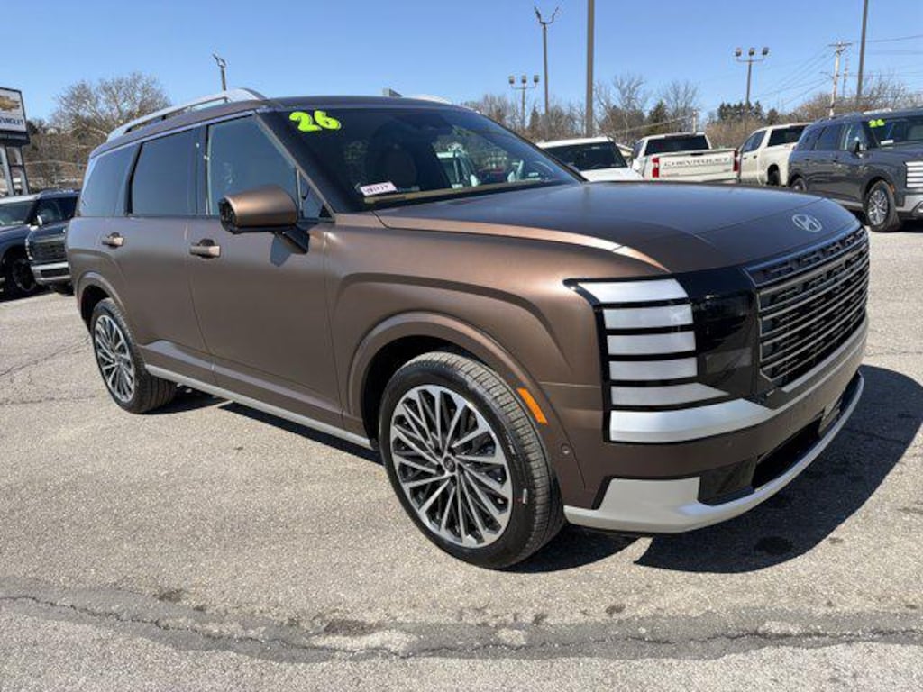 Set yourself up for success behind our tremendous 2026 Hyundai Palisade Calligraphy AWD in Earthy Brass Matte. Driven by a 3.5 Liter V6 delivering 287hp through a paddle-shifted 8 Speed Automatic transmission for confident, smooth driving. Engineered with All Wheel Drive and multiple drive modes, this luxury SUV achieves nearly 24mpg on the highway while providing refined handling. Striking from every angle, the Palisade Calligraphy showcases upscale features like signature LED lighting, a dual-pane sunroof, exclusive 20-inch alloy wheels, silver roof rails, a hands-free smart liftgate, and a bold satin chrome grille.